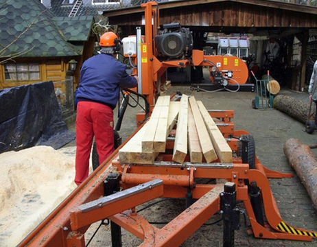Die mobile Säge ist angekommen, aufgebaut und eingerichtet. Jetzt werden Kanthölzer, Bohlen und Bretter auf Wunschmaß geschnitten.